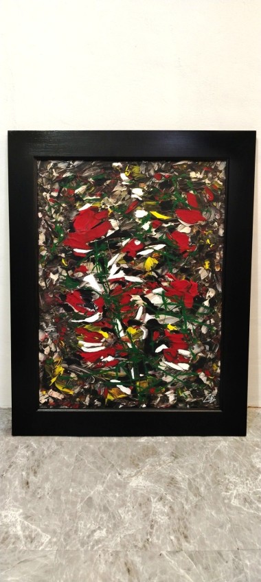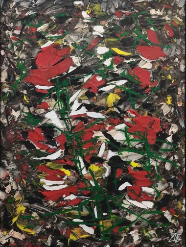 Intense contrasts of vibrant red, green, and dark hues create a sense of energy and chaotic movement, evoking a lively and powerful atmosphere.