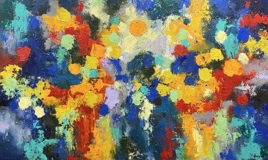 Bold and vibrant color contrasts using a rich palette of blues, yellows, and oranges create an energetic and joyful atmosphere, evoking optimism and liveliness.
