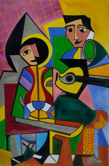 Bright and bold colors mix with dynamic geometric patterns, exuding a sense of energy and liveliness that conveys the joyful spontaneity of musical expression.