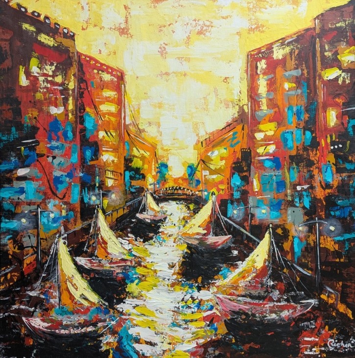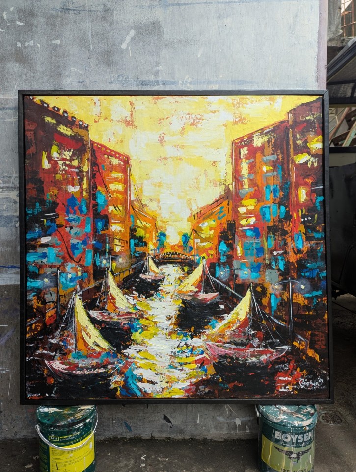 Using bold, radiant colors and energetic brushstrokes, it conveys a lively and dynamic atmosphere, capturing the essence of a bustling urban canal under vibrant light.