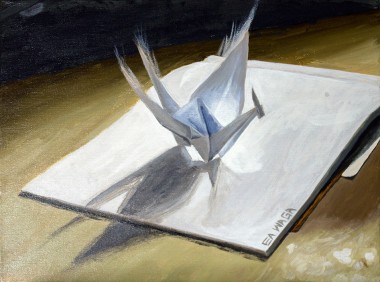 Soft neutral tones and precise lighting create a serene, meditative feeling, highlighting the fragility of the origami crane and its shadow. The interplay of light and shadow fosters introspection and calmness.