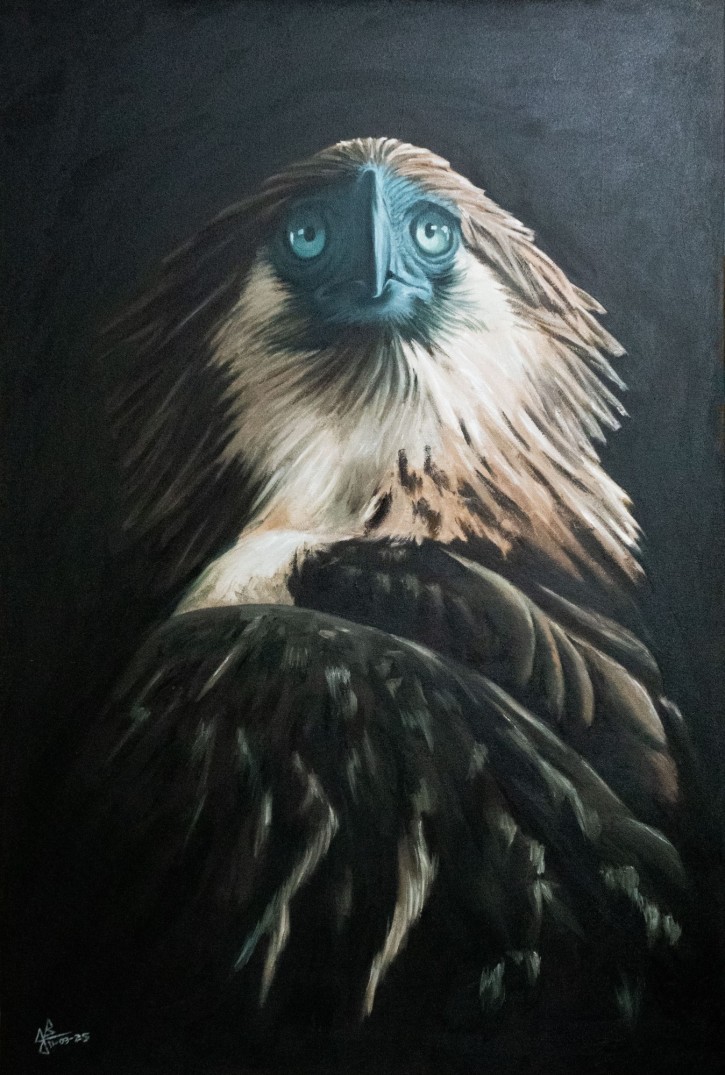 The reference of this piece is a photo of a Philippine Eagle named Girlie, a one-eyed queen, she has been shot in her right eye and trapped by a poacher way back in 1982. She was rescued and brought to the DENR, where she was later transferred to the Philippine Eagle Center in Davao to serve as breeding stock.